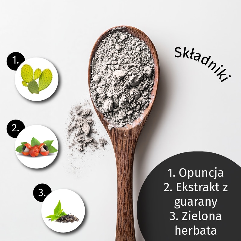 Składniki: proszek inuliny, proszek z tapioki, łuska babki jajowatej (Plantago ovata), ekstrakt z opuncji figowej (Opuntia ficus-indica, cladody)¹, aromat brzoskwiniowy, aromat cytrynowy, ekstrakt z zielonej herbaty (Camellia sinensis (L.) Kuntze, liść), ekstrakt z guarany (Paullinia cupana Kunth, nasiono), stabilizator: celuloza, koncentrat z buraka czerwonego (maltodekstryna, proszek z buraka czerwonego (Beta vulgaris)), słodzik: glikozydy stewiolowe ze stewii. Zawiera naturalnie występujące cukry i kofeinę.