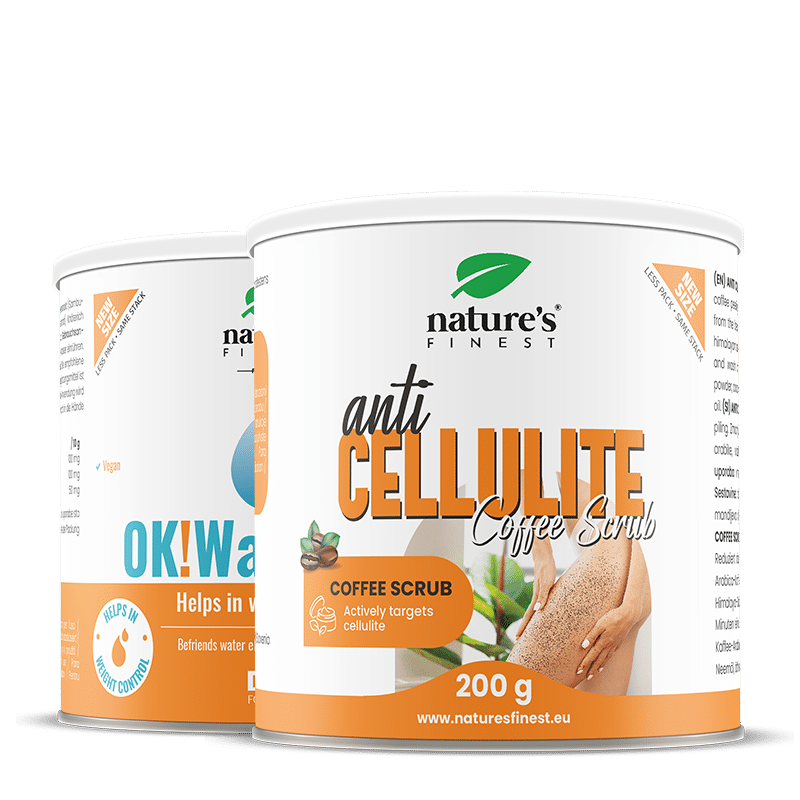 Kawowy peeling antycellulitowy: mielone ziarna kawy arabica*, różowa sól himalajska, olej kokosowy extra virgin *, tłoczony na zimno olej migdałowy, nierafinowany olej neem, liście neem, witamina E. OK!WaterOut: maltodekstryna, błonnik bambusowy, naturalny aromat ananasowy, wyciąg z korzenia pokrzywy, wyciąg z czarnego bzu, substancja słodząca: glikozyd stewiolowy.