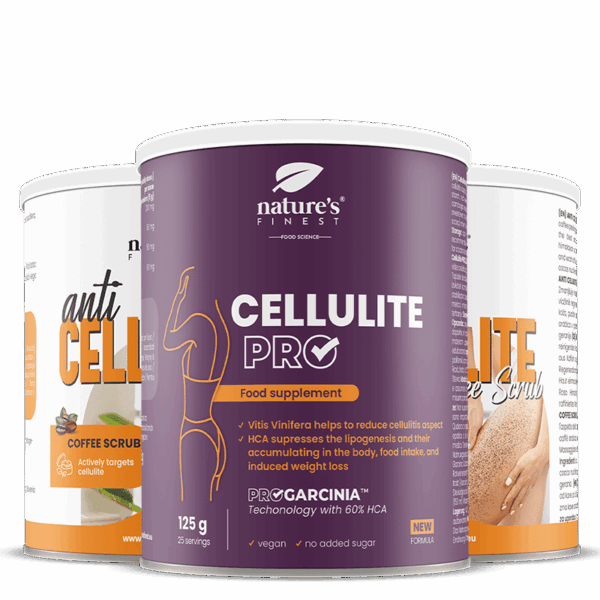 Cellulite PRO: Dzięki ProGarcinia™ i ekstraktowi z czerwonego wina ta antycellulitowa formuła pomaga kształtować sylwetkę, tłumić napady głodu i redukować widoczny cellulit! Dzięki peelingowi kawowemu Anti Cellulite w łatwy i naturalny sposób pozbędziesz się cellulitu. Działa również na wyjątkowo problematyczne miejsca, gdzie poduszki tłuszczowe są najbardziej oporne.