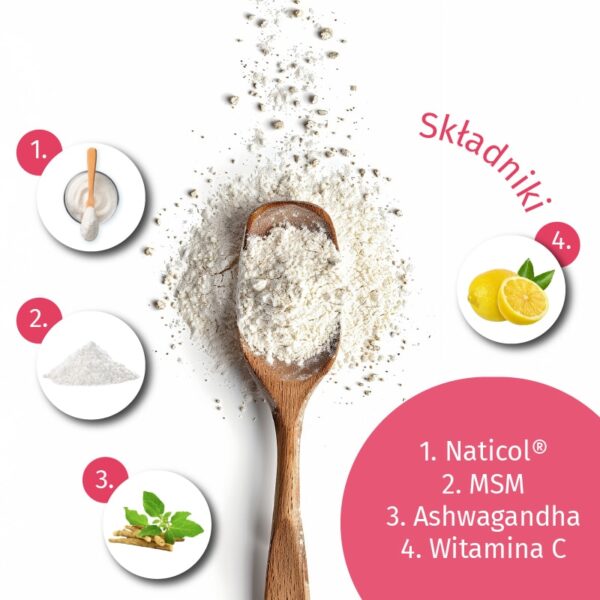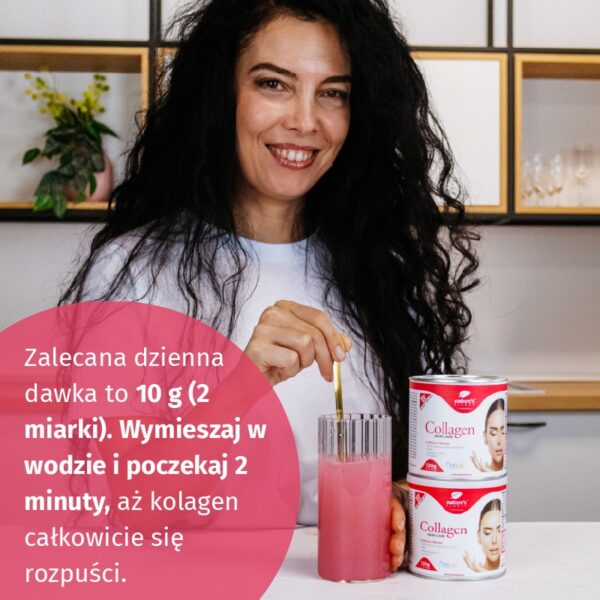 Zalecana dzienna dawka to 10 g (2 miarki). Wymieszaj w wodzie i poczekaj 2 minuty, aż kolagen całkowicie się rozpuści. Przy 10 g proszku spożywasz 5 g peptydów kolagenowych Naticol.