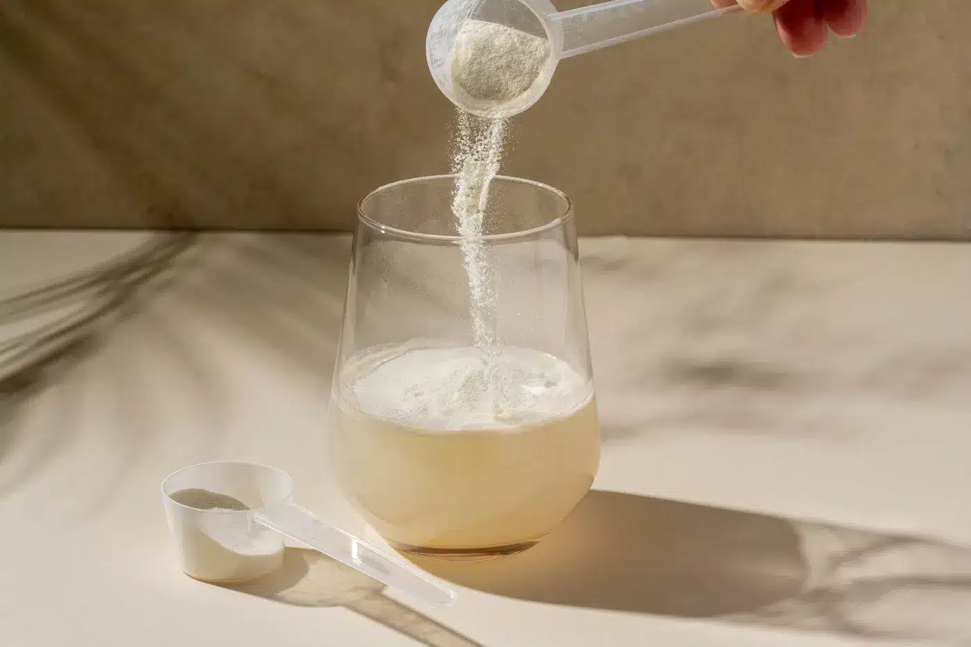 Dodaj 5 g każdego produktu (Witamina C, Magnez, Wapń, Kompleks B i Witamina D3) do szklanki wody, dokładnie wymieszaj i wypij.